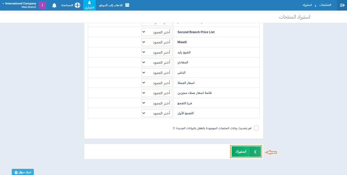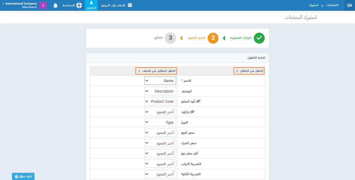 قم بمطابقة الحقول بين البيانات الموجودة في الملف الذي قمت برفعه وبين الحقول المقابلة لها داخل النظام، لضمان استيراد المعلومات بشكل صحيح ومنظم.