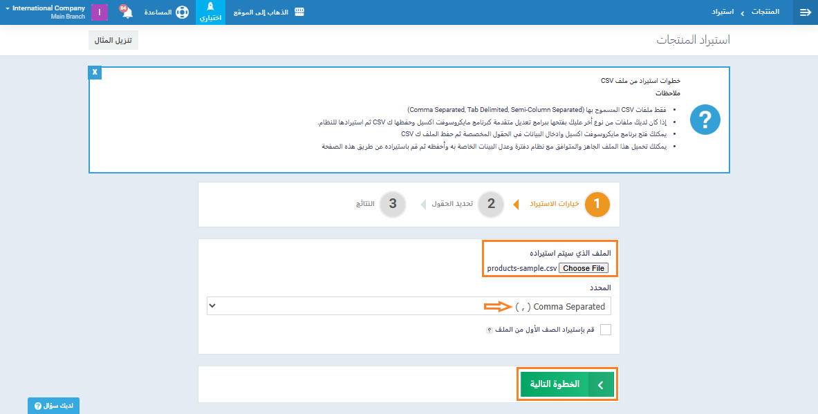 اختر الملف المطلوب بالضغط على زر “Choose File”، ثم حدد خيار “Comma Separated” للتنسيق، وبعدها اضغط على زر “الخطوة التالية” للمتابعة.