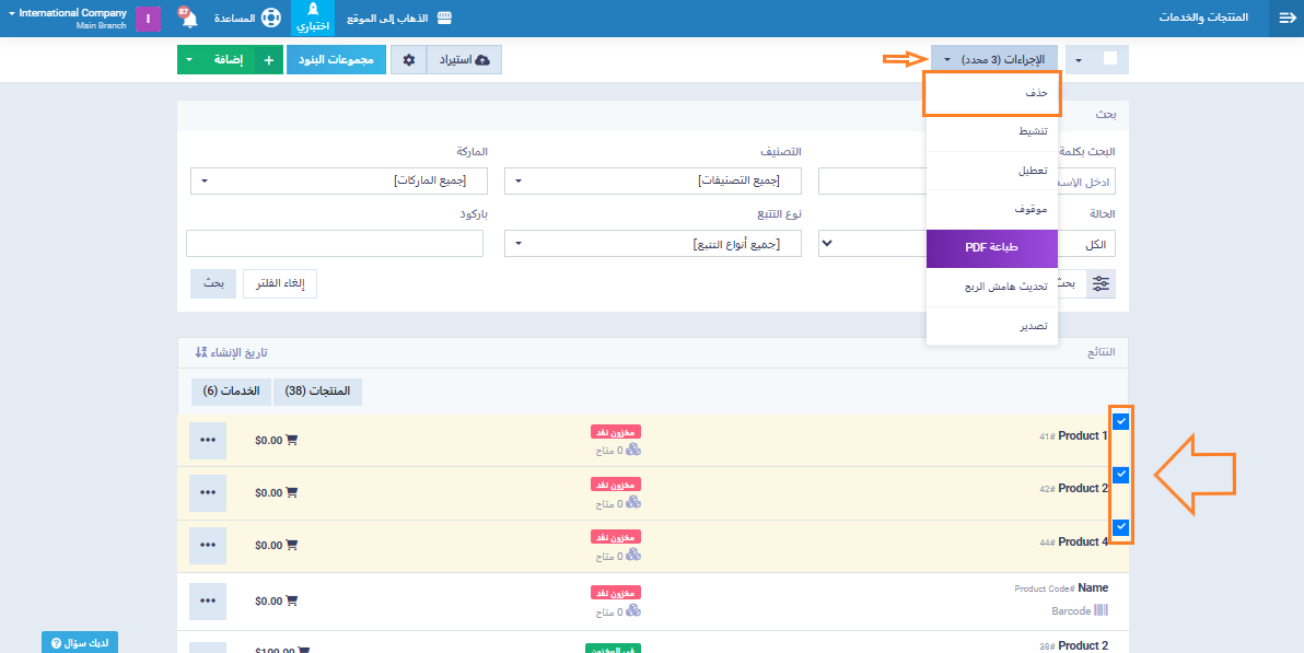وفي حال رغبتك في حذف المنتجات نهائيًا من النظام، قم بتحديد المنتجات المطلوبة عبر تفعيل مربع الاختيار بجانبها، ثم من قائمة “الإجراءات” اختر خيار “حذف“.