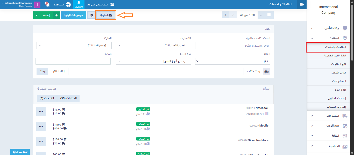 من القائمة الرئيسية اضغط على “المنتجات والخدمات“, ثم اضغط على زر “استيراد“.