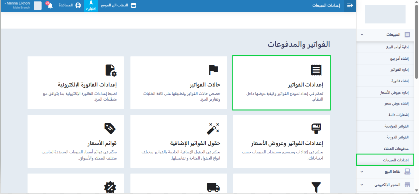 اضغط على “إعدادات المبيعات” المنسدلة عن “المبيعات” بالقائمة الرئيسية ثم اضغط على “إعدادات الفواتير”