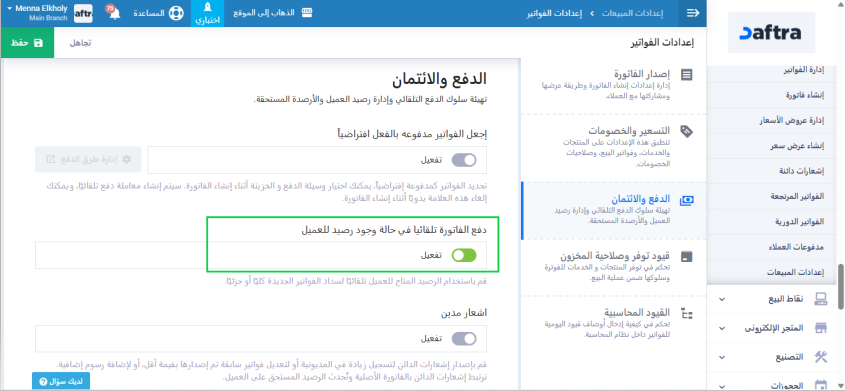 فعّل إعداد “دفع الفاتورة تلقائيا في حالة وجود رصيد للعميل” ثم اضغط على زر “حفظ”.