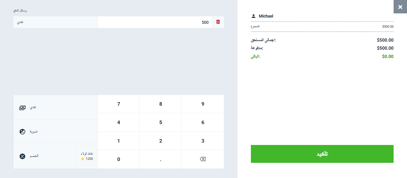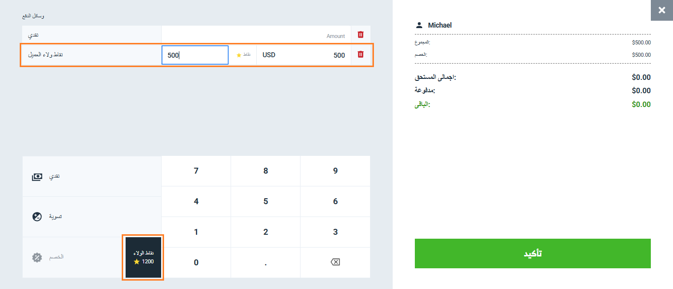 إذا كان العميل المحدد قد جمع نقاط ولاء، فستظهر هذه النقاط على شاشة نقطة البيع مع قيمتها المالية المكافئة. يمكن للعميل اختيار استبدال هذه النقاط كدفعة كاملة أو جزئية نحو الفاتورة، مما يقلل المبلغ الإجمالي المستحق وفقاً لذلك.