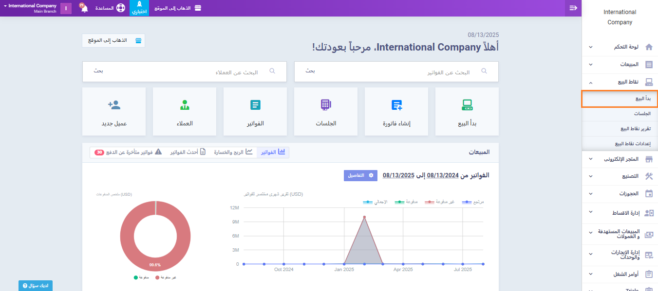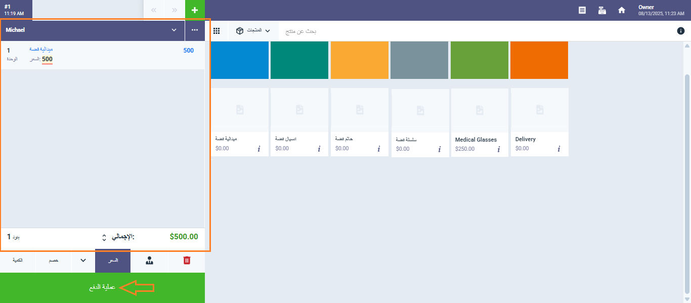 اختر العميل وأضف المنتج المطلوب إلى الفاتورة للمتابعة في إضافة الدفعة. بعد إضافة العميل والمنتج، اضغط على “عملية الدفع” للانتقال إلى شاشة الدفع.