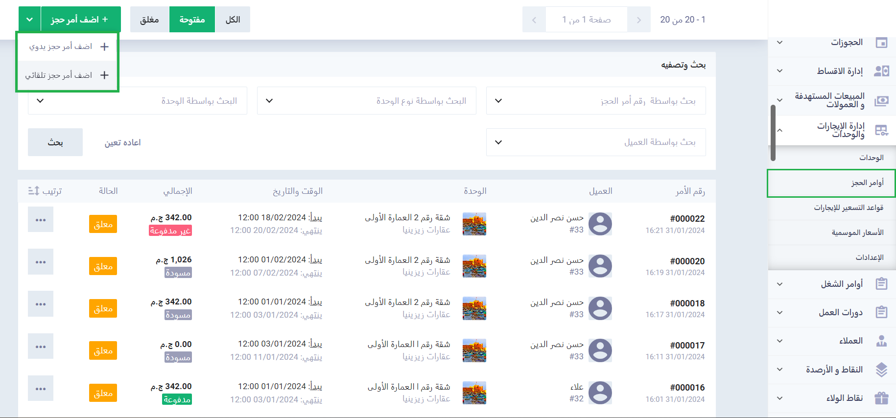 اضغط على “أوامر الحجز” المنسدلة عن “إدارة الوحدات والإيجارات” بالقائمة الرئيسية ثم اضغط على زر “أضف أمر حجز” واختر “أضف أمر حجز يدوي”.