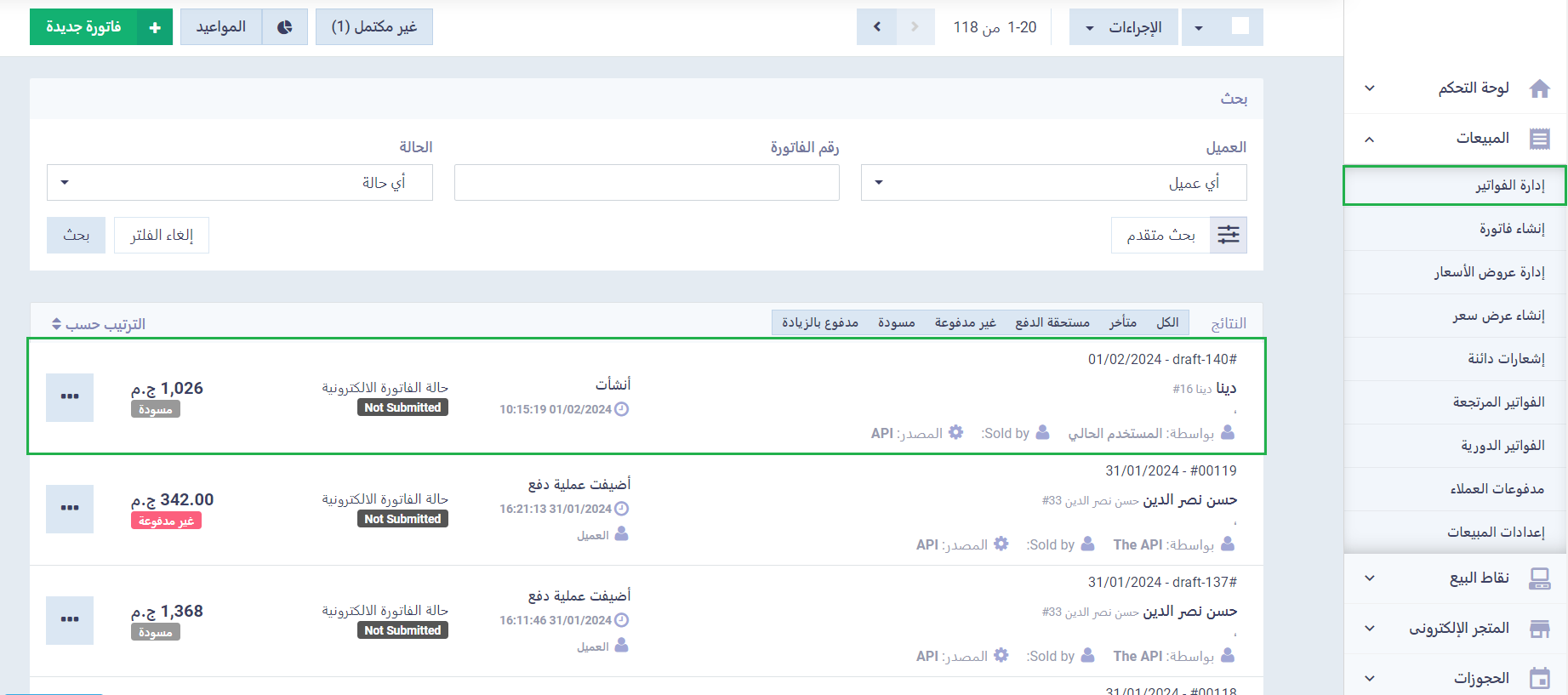يمكنك الإطلاع على فواتير أمر الحجز وإضافة عملية دفع أو تحويلها من مسودة إلى فاتورة نهائية بالضغط على “إدارة الفواتير” المنسدلة عن المبيعات بالقائمة الرئيسية،