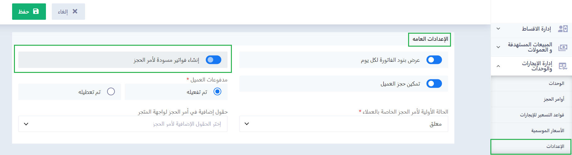 - ويمكنك التحكم في أن تصدر هذه الفواتير كمسودة أو كفواتير نهائية من خلال إعدادات الإيجار العامة.