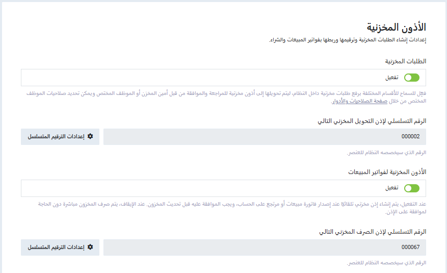 تتحكم هذه الإعدادات في طريقة إدارة المنتجات والمخزون داخل النظام، من حيث التهيئة، التتبع، الجرد، الأذون المخزنية، والقيم الافتراضية.