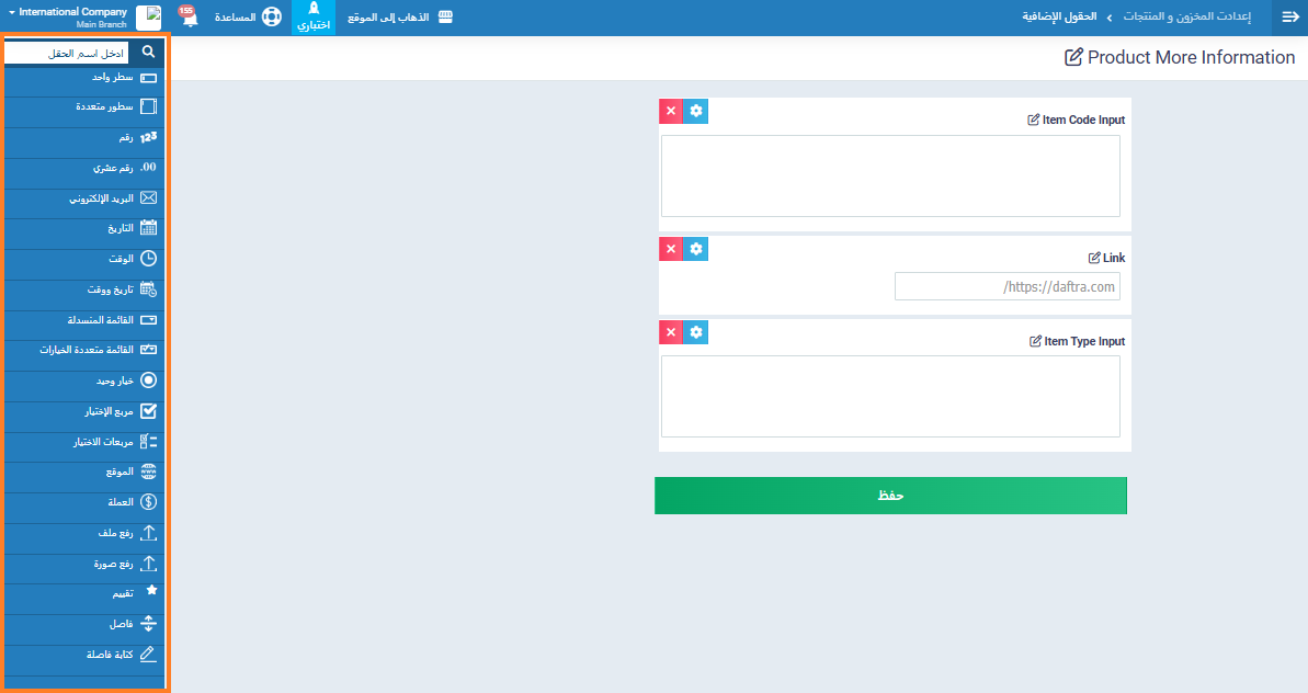 من قائمة الحقول الجانبية، يمكنك اختيار الحقل المطلوب وإدراجه ضمن بيانات المنتج، مع إمكانية تعديل خصائصه حسب الحاجة، مثل اسم الحقل ونوعه وطريقة عرضه، لضمان تسجيل المعلومات الإضافية وتنظيمها بالشكل المناسب داخل النظام.