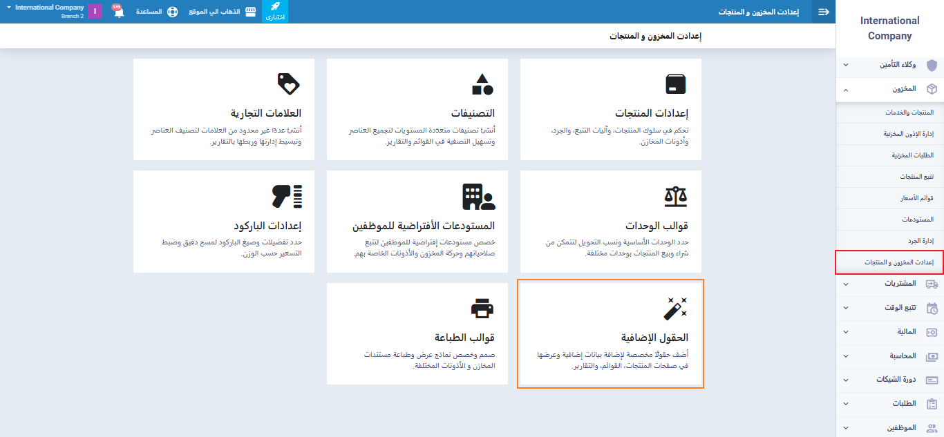 الإعداد التالي هو “الحقول الإضافية“، ويتيح لك إضافة حقول مخصّصة لتسجيل بيانات إضافية للمنتجات حسب احتياجات نشاطك. تساعد هذه الحقول على توسيع معلومات المنتج، وتنظيمها بشكل أفضل، مع إمكانية عرضها في صفحات المنتجات، القوائم، والتقارير داخل النظام.
