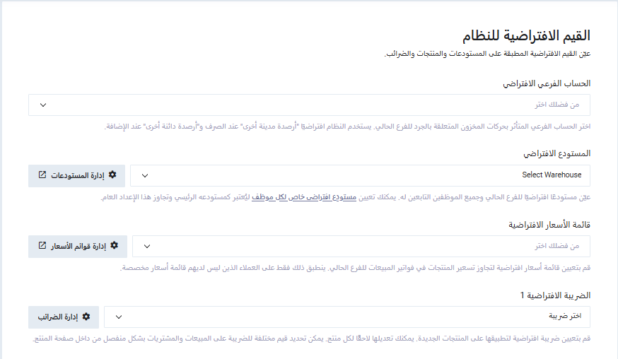 - الحساب الفرعي الافتراضي: تحديد الحساب المحاسبي لحركات المخزون.