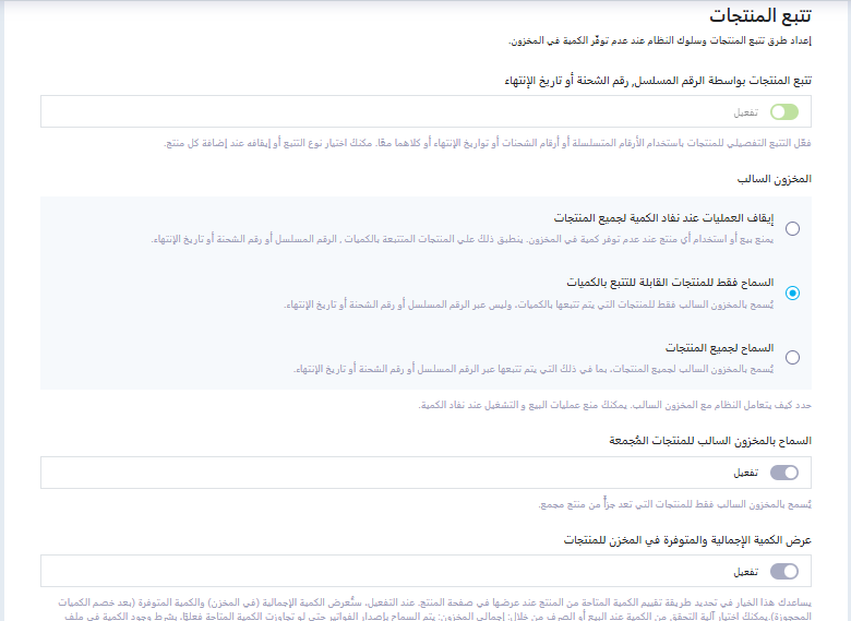 تحدد طريقة تتبع المنتجات وسلوك النظام عند نفاد الكمية: