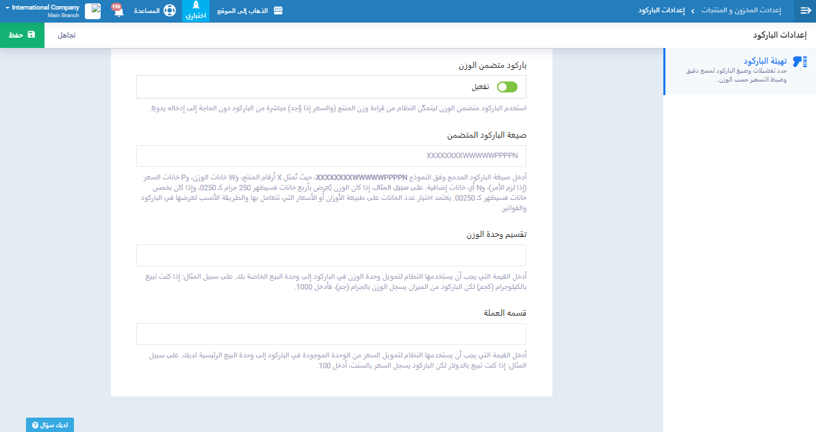 - تقسيم وحدة الوزن: تحديد كيفية تحويل وحدات الوزن عند استخدام الباركود للمنتجات الموزونة.