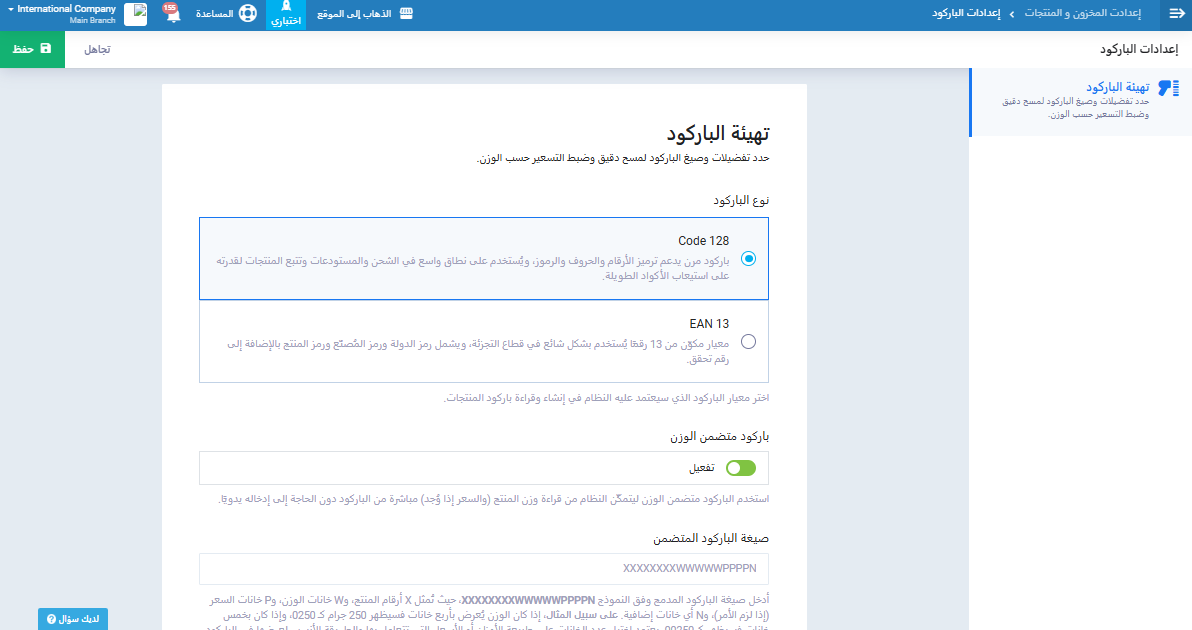 - باركود مخصص الوزن: تفعيل هذا الخيار يسمح للنظام بقراءة الوزن مباشرة من الباركود عند مسح المنتجات القابلة للوزن.