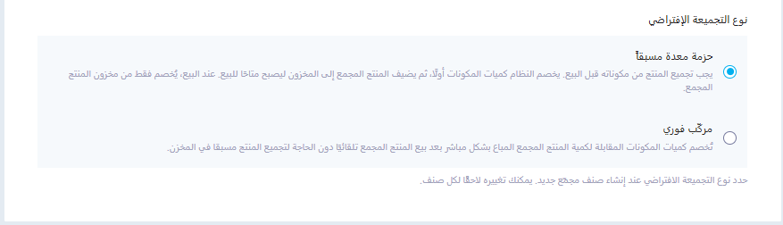 - نوع التجميعة الافتراضي: تحديد طريقة الخصم (تجميع مسبق أو خصم مباشر عند البيع).