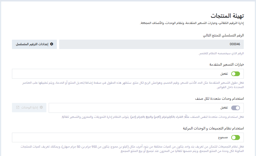 تساعد هذه الإعدادات في ضمان إدارة دقيقة للمخزون، سهولة تتبع المنتجات، وضبط التسعير التلقائي للمنتجات بحسب الوزن أو الكمية.