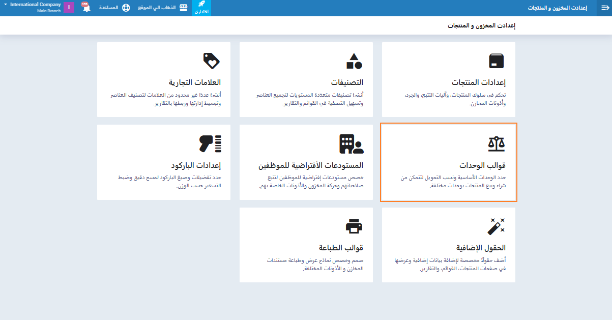 - قوالب الوحدات: تحديد الوحدات الأساسية ونسب التحويل للشراء والبيع بوحدات مختلفة.