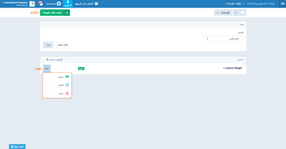 اضغط على زر “أضف قالب الوحدة” لإضافة وحدة جديدة للنظام، مع تحديد اسم الوحدة ونسب التحويل الخاصة بها لتسهيل إدارة المخزون والتسعير. كما يمكنك الضغط على الثلاث نقاط بجانب أي وحدة مضافة بالفعل للوصول إلى الإجراءات المتاحة، مثل عرض تفاصيل الوحدة، تعديل بياناتها، أو حذفها من النظام.