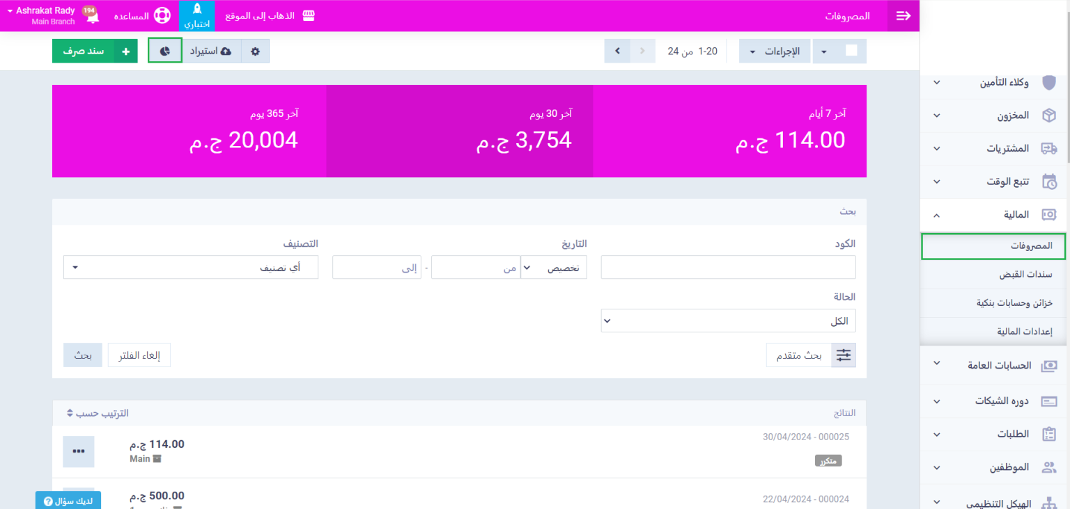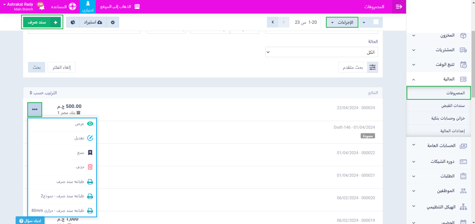 اضغط على “المصروفات” المنسدلة عن “المالية” بالقائمة الرئيسية واضغط على زر “سند صرف” لإنشاء سند صرف جديد.