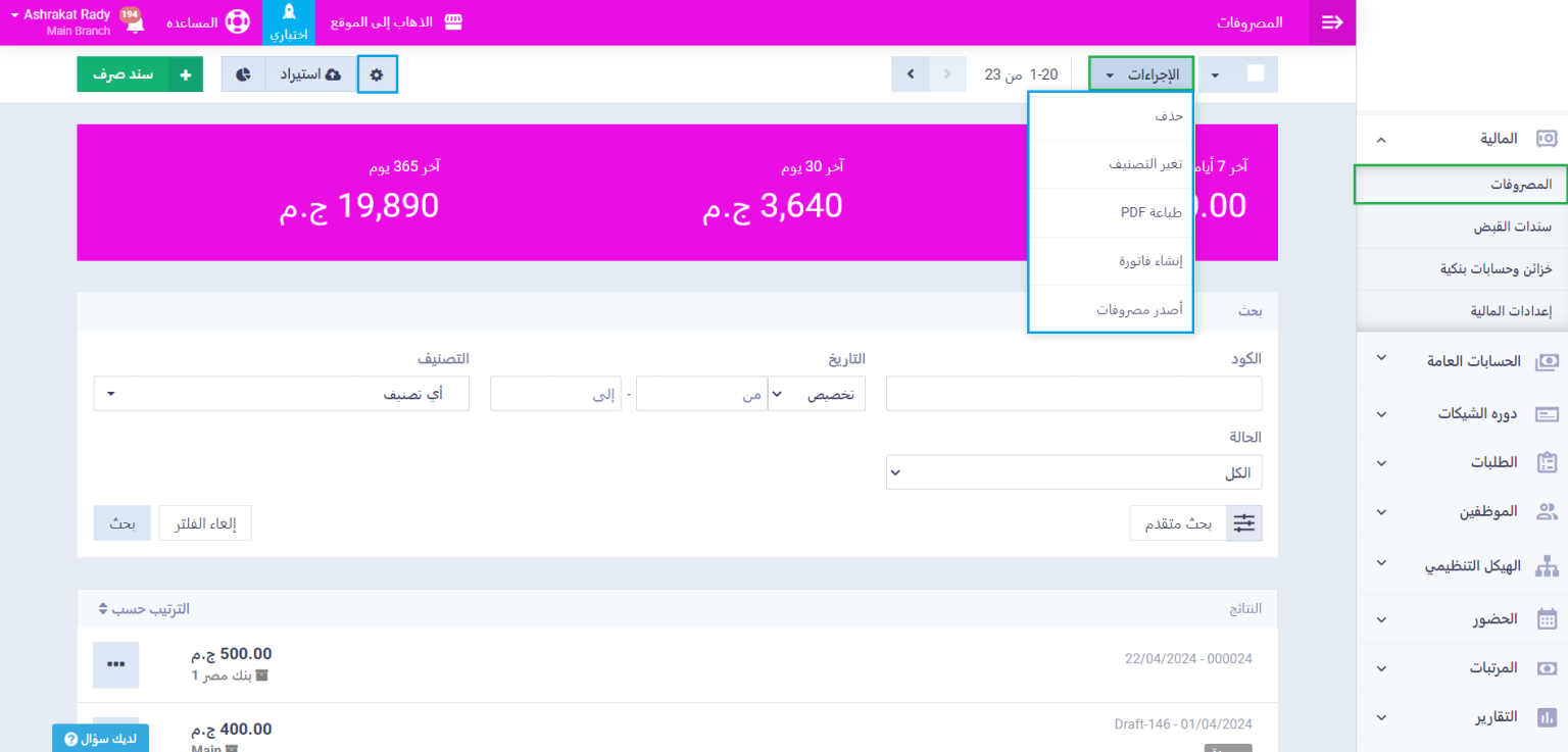 يمكنك القيام ببعض الإجراءات على المصروفات كالحذف والطباعة وإنشاء فاتورة على المصروف كما يمكنك إنشاء تصنيفات تنتمي لها المصروفات.