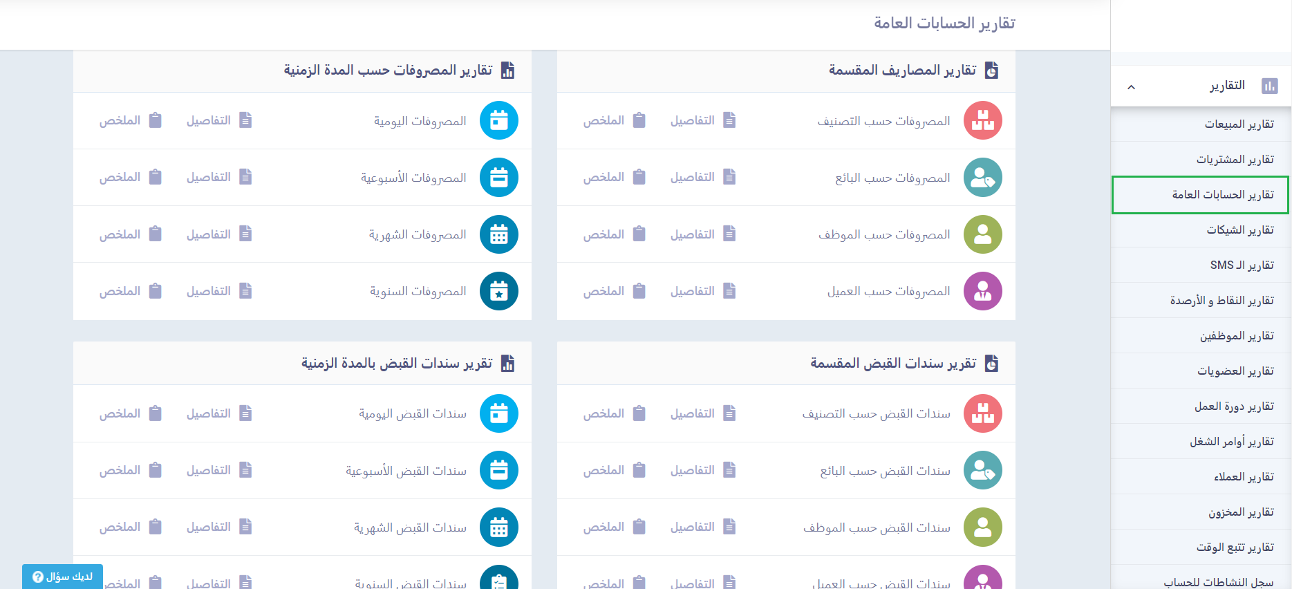 أو بالضغط على “تقارير الحسابات العامة” المنسدلة عن “التقارير” بالقائمة الرئيسية واختر تقرير المصروفات المراد عرضه واضغط على “التفاصيل”
