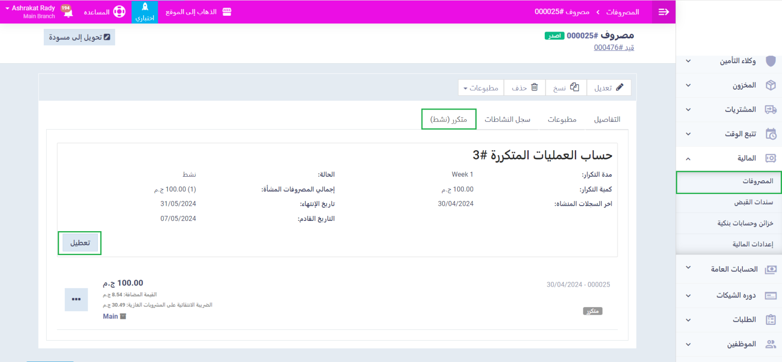 لتعطيل تكرار المصروف، اذهب لقائمة المصروفات واضغط على المصروف المراد، واضغط على تبويب “متكرر” ثم اضغط على زر “تعطيل”.