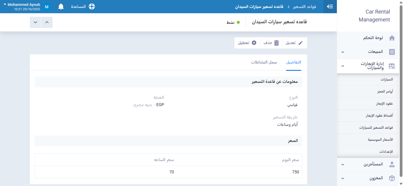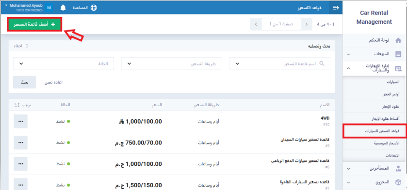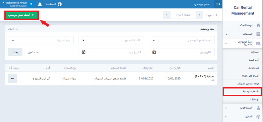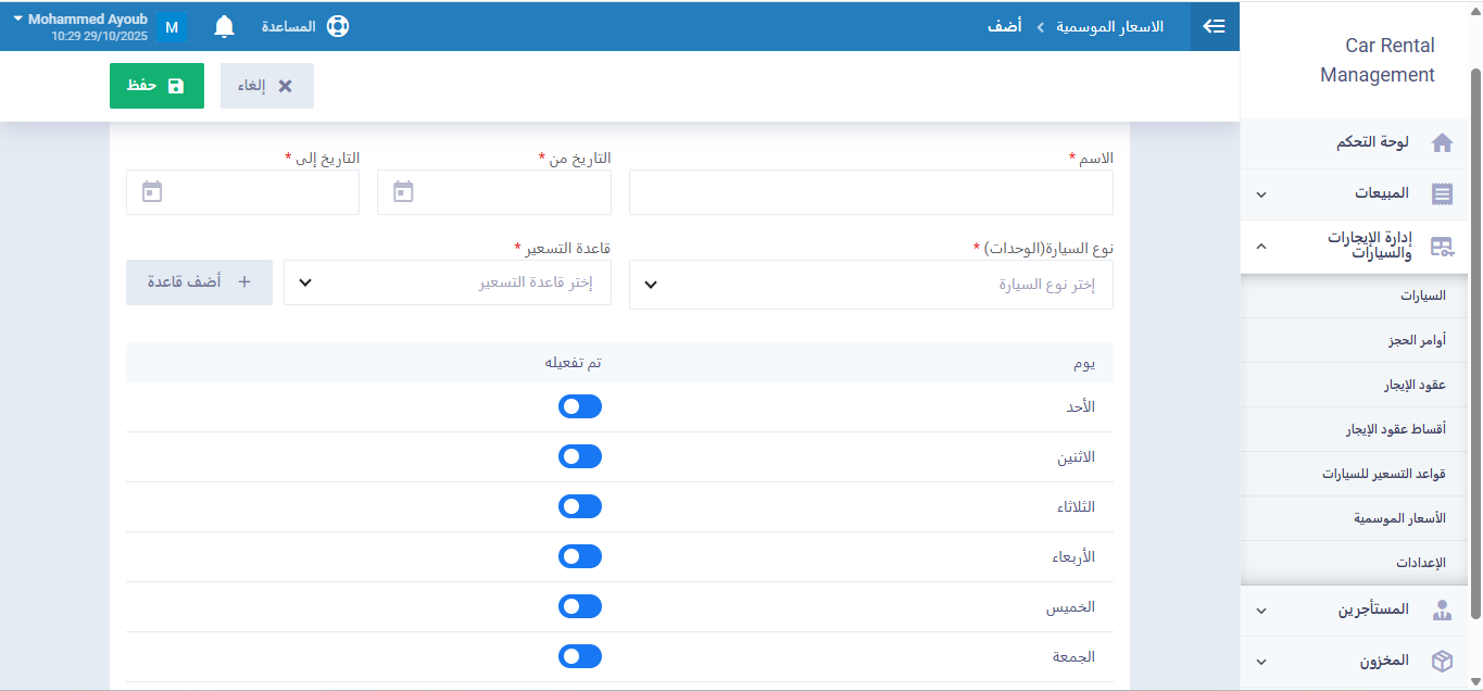 مع إمكانية إنشاء قواعد أسعار موسمية مختلفة عن الأسعار الاعتيادية، يتم تطبيقها على سيارات محددة وفي فترة زمنية محددة.
