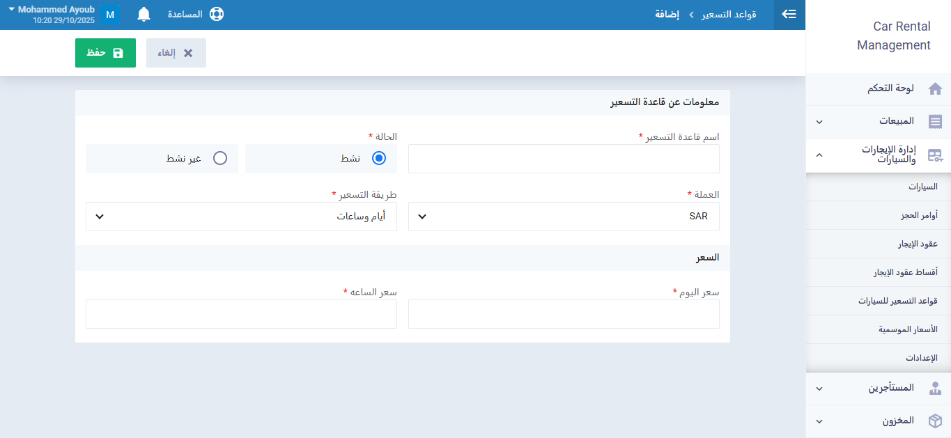 - طريقة التسعير: يتيح لك النظام ثلاث طرق للتسعير، بالساعات فقط أو الأيام فقط أو الأيام والساعات معًا.