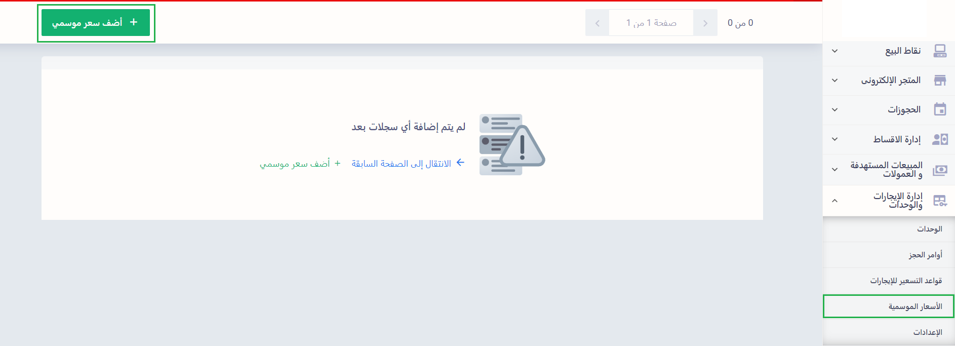 اضغط على “الأسعار الموسمية” المنسدلة عن “إدارة الإيجارات والوحدات” بالقائمة الرئيسية ثم اضغط على زر “أضف سعر موسمي”.