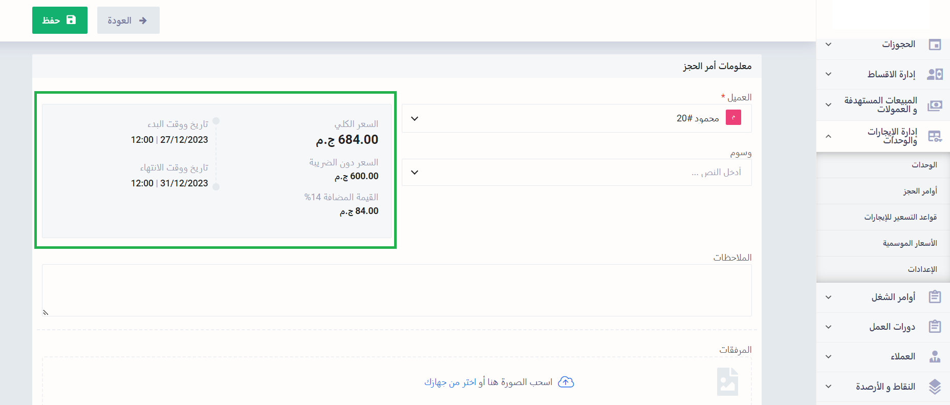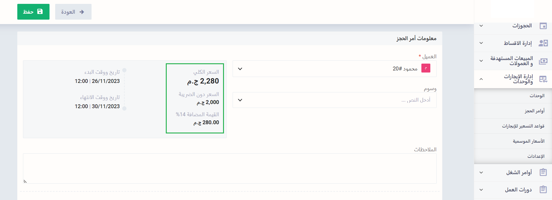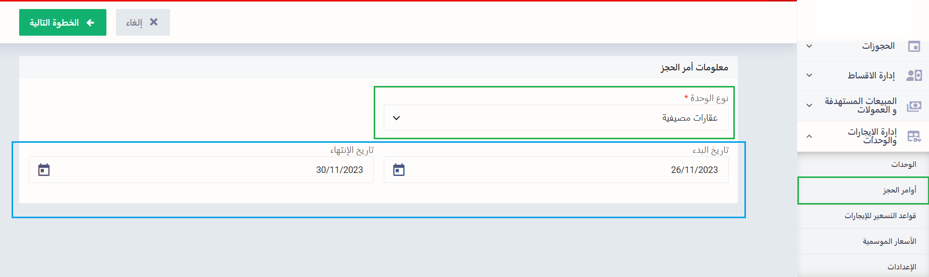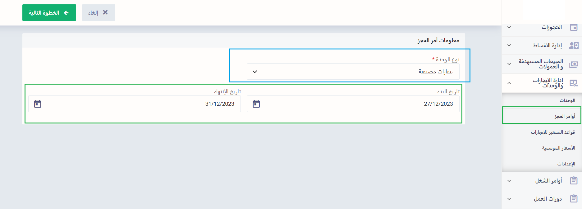 لاختبار فعالية السعر الموسمي، اضغط على “أوامر الحجز” المنسدلة عن “إدارة الإيجارات والوحدات” بالقائمة الرئيسية وأضف أمر حجز جديد، واختر أحد الوحدات التي عينتها بالسعر الموسمي وكذلك اختر تاريخًا متضمن بفترة السعر الموسمي.