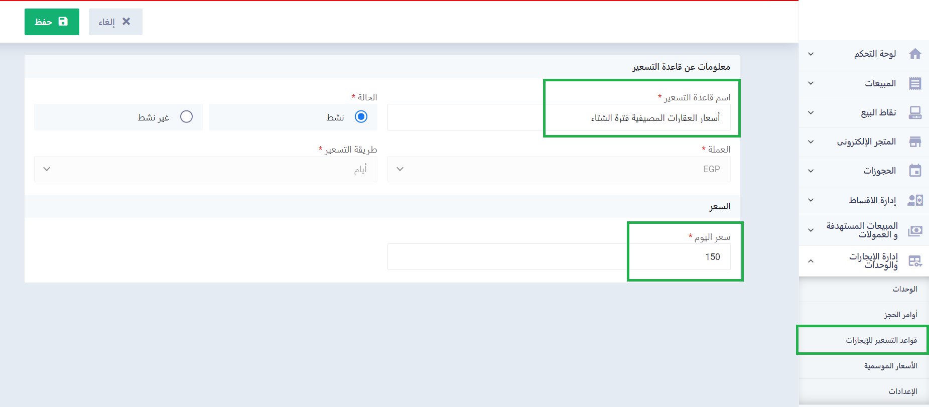 مع إمكانية إنشاء قواعد أسعار موسمية مختلفة عن الأسعار الاعتيادية، يتم تطبيقها على أنواع وحدات محددة وفي فترة زمنية محددة.