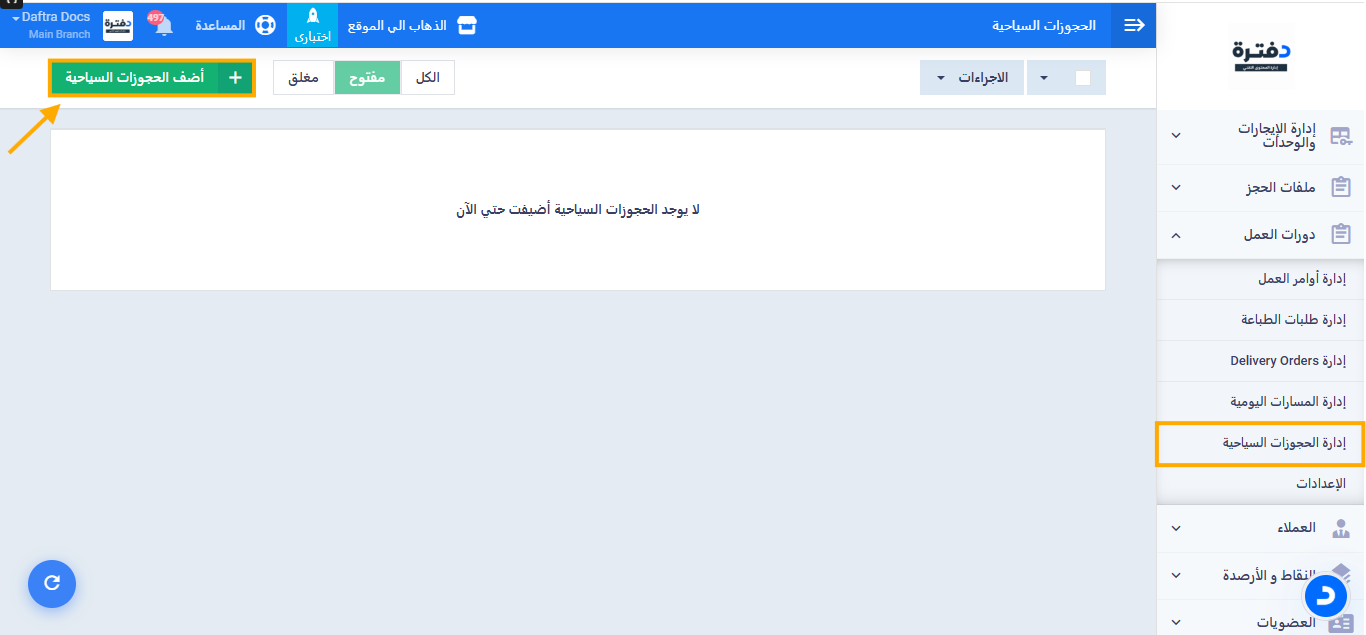 بعد التفعيل مباشرةً، سيُضاف تلقائيًا بند «الحجوزات السياحية» ضمن قسم «دورات العمل» في القائمة الرئيسية.