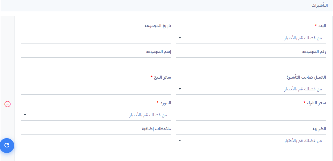 لإدخال بيانات التأشيرات المرتبطة بالحجز، انتقل إلى تبويب التأشيرات داخل ملف الحجز، ثم قم بتعبئة الحقول التالية: