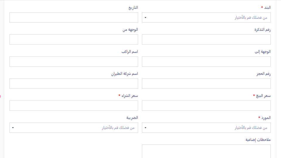 لإدخال بيانات الرحلات الجوية، انتقل إلى تبويب الطيران داخل ملف الحجز، ثم قم بإدخال البيانات التالية: