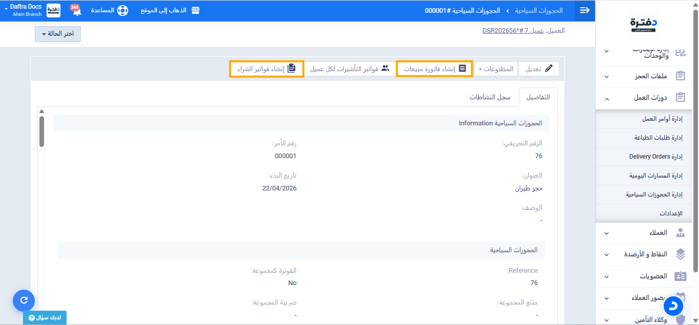جميع الفواتير التي يتم إنشاؤها، سواء كانت فواتير مبيعات أو مشتريات، تظل مرتبطة بملف الحجز الأصلي