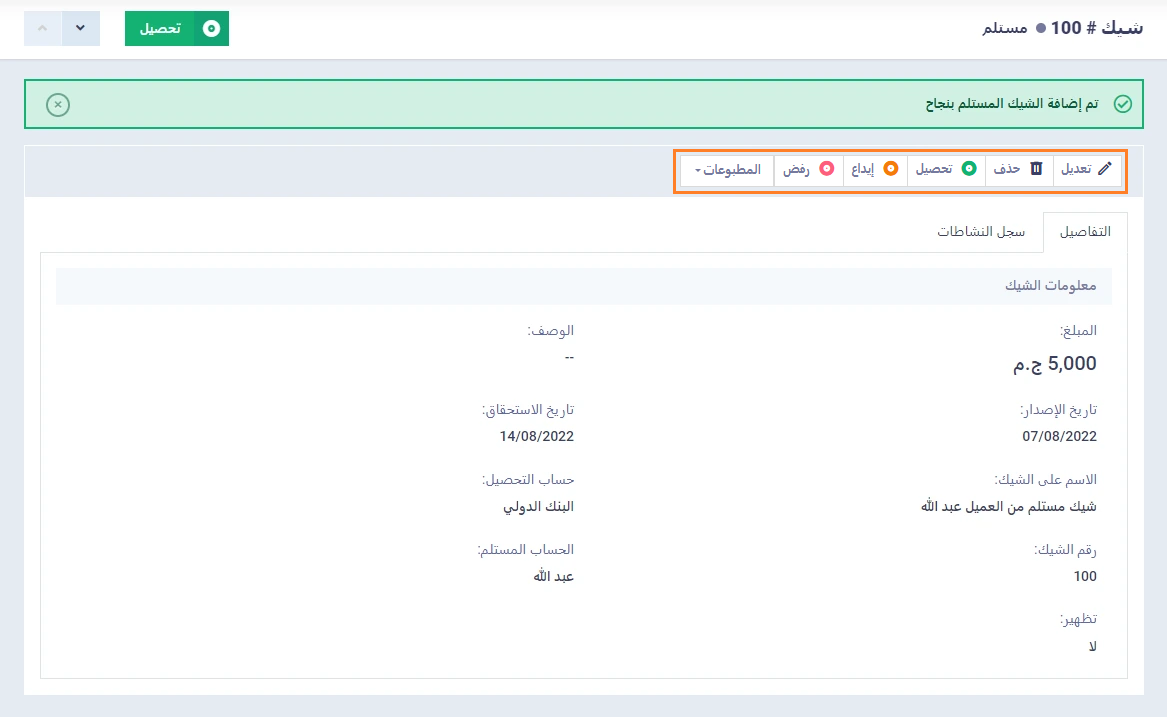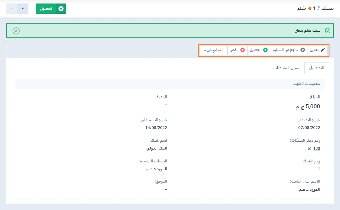 بعد الضغط على “تحصيل” تتغير حالة الشيك من مجرد شيك “تم استلامه” إلى شيك “تم تحصيله”، وتنتقل بك لوحة التحكم إلى الصورة التالية: