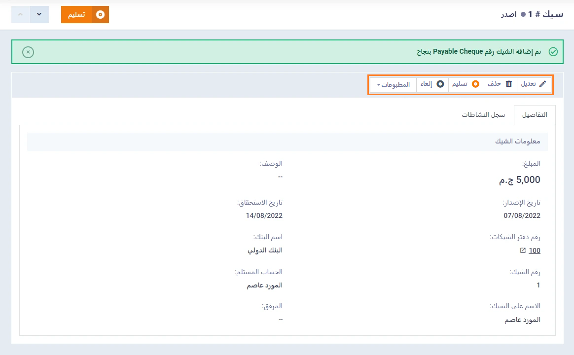 ستظهر لنا في أعلى لوحة التحكم في دفتر الشيكات الخيارات الثلاثة: تعديل، حذف، تعطيل. كما هو موضح في الصورة: