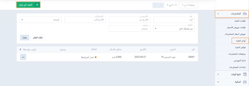 كما يمكننا إضافة أمر شراء جديد بالضغط على “المشتريات” من القائمة الرئيسية، ثم “أوامر الشراء“، ثم “أضف أمر شراء“: