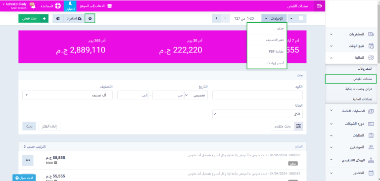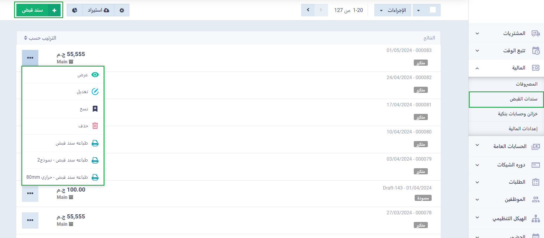 كما يمكنك القيام بالإجراءات المرادة على أي سند قبض قديم كالتعديل والحذف.
