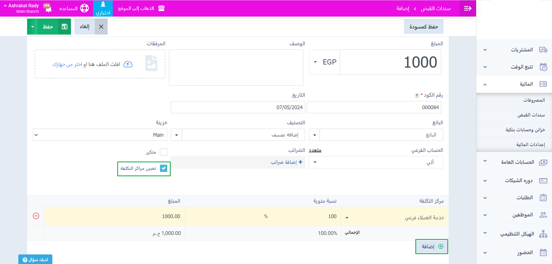 فعّل “تعيين مراكز التكلفة” لربط كل أو جزء من قيمة سند القبض مع أحد مراكز التكلفة بالحساب.