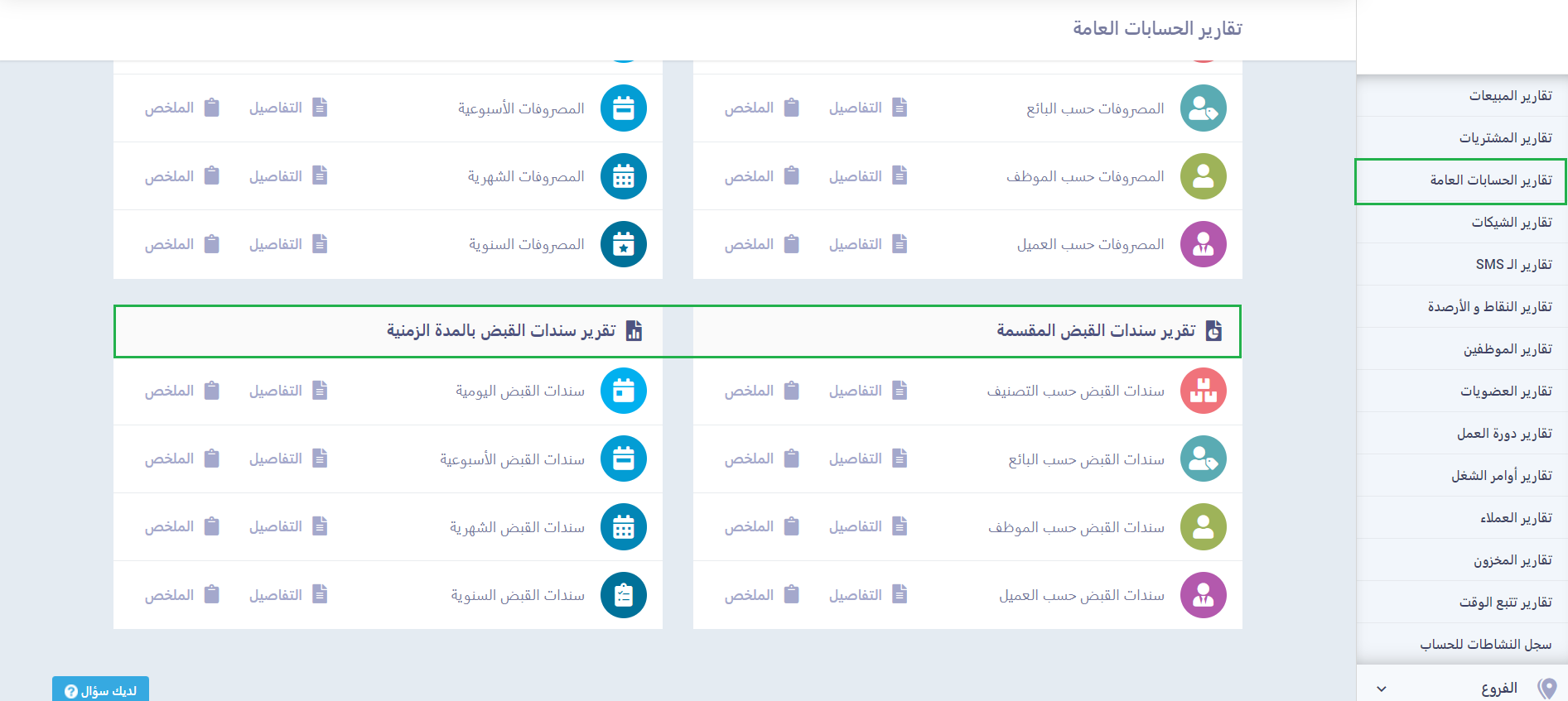 أو بالضغط على “تقارير الحسابات العامة” المنسدلة عن “التقارير” بالقائمة الرئيسية واختر تقرير سند القبض المراد عرضه واضغط على “التفاصيل”