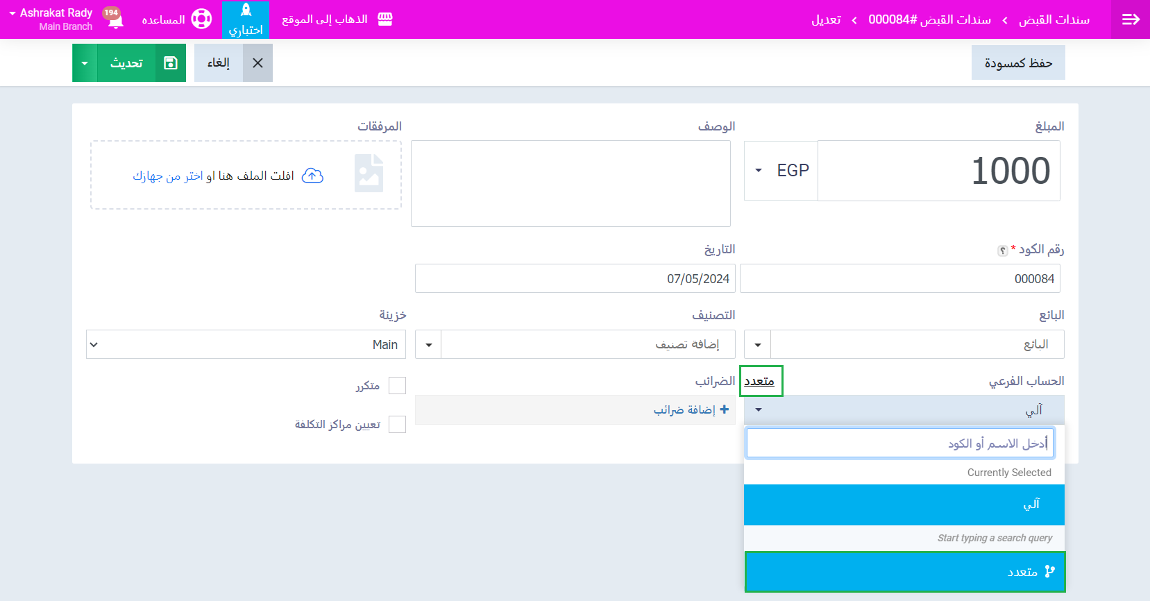 الحساب الفرعي: يمكن إعادة توجيه الطرف الدائن لسند القبض من خلال تحديد الحساب المطلوب من القائمة.