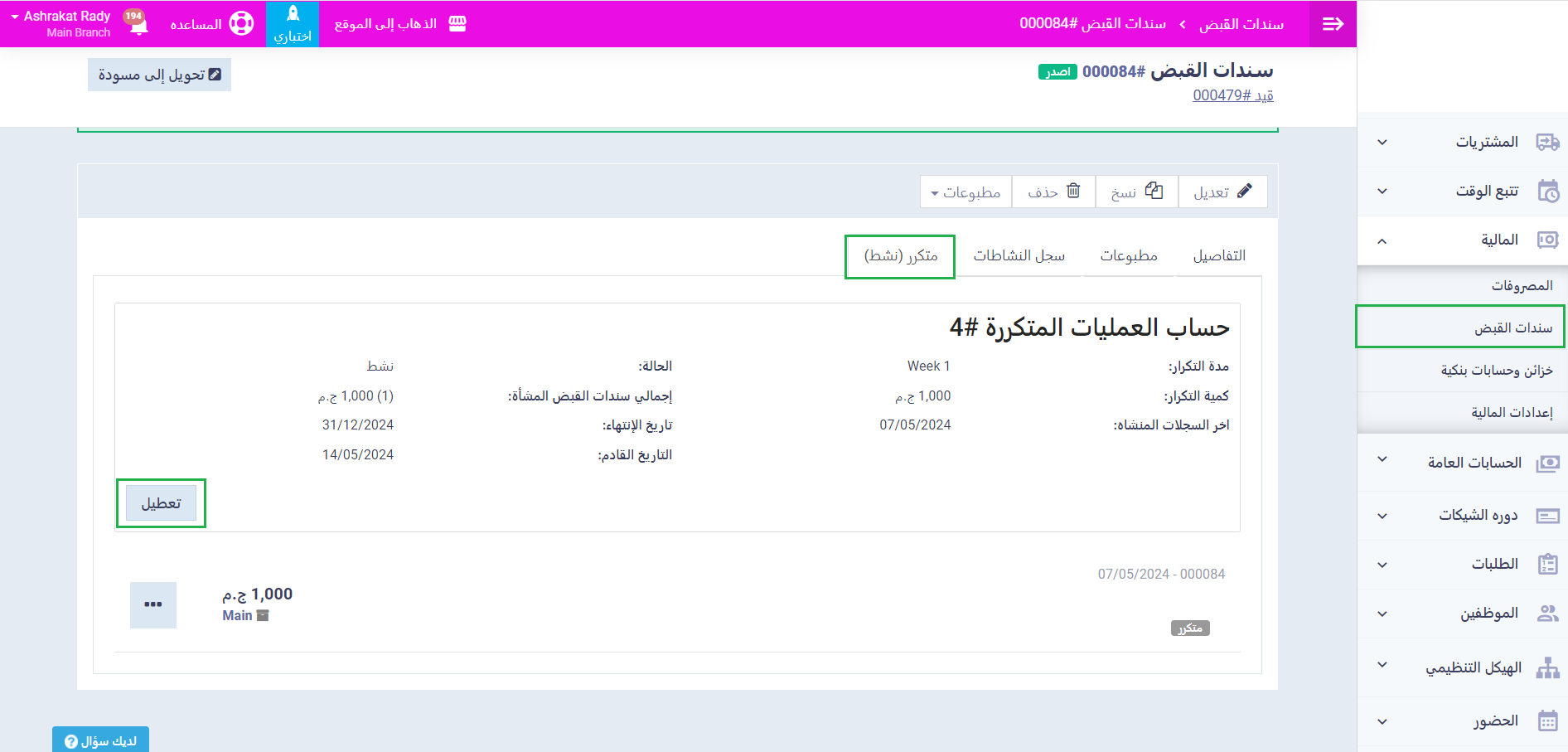 لتعطيل تكرار سند القبض، اذهب لقائمة سندات القبض واضغط على السند المراد، واضغط على تبويب “متكرر” ثم اضغط على زر “تعطيل”.