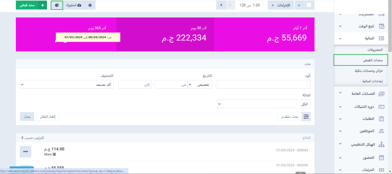 التاريخ: حدد من التقويم تاريخ إضافة سند القبض إلى النظام.