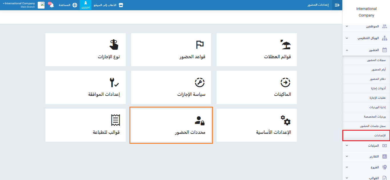 يمكن إنشاء قيد الحضور للموظف عن طريق الضغط على “الحضور” من القائمة الرئيسية، ثم “الإعدادات” ثم نضغط على بطاقة “محددات الحضور” كما في الصورة التالية: