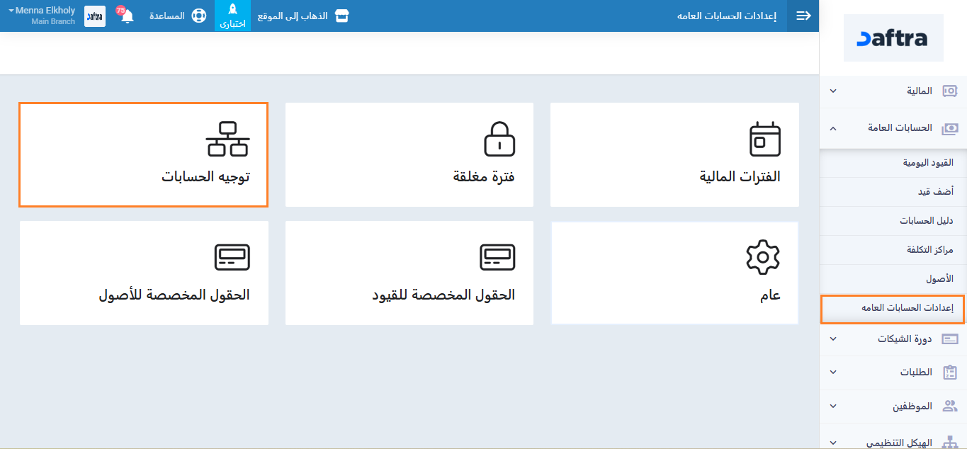 ولكي نقوم بتغيير نوع توجيه حسابات الموردين، علينا أولًا الضغط على “الحسابات العامة” من القائمة الرئيسية، ثم “إعدادات الحسابات العامة“، ونختار بطاقة “توجيه الحسابات“.