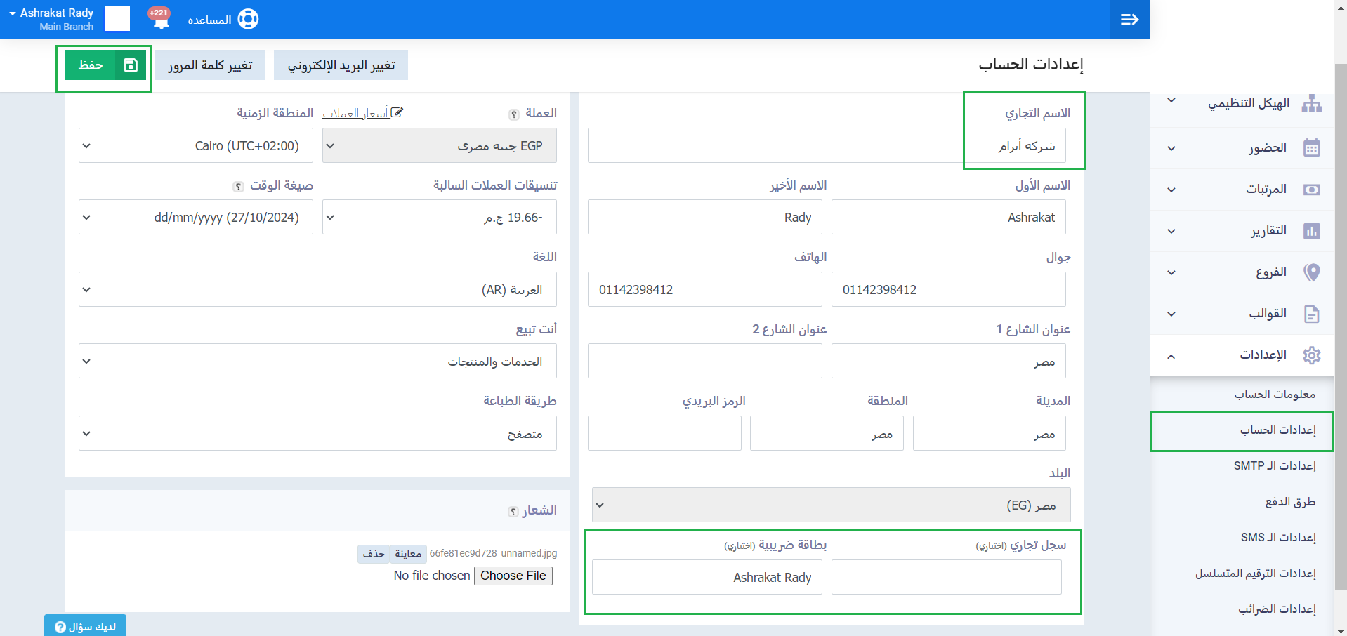 تأكد من تفعيل زر “الفاتورة الإلكترونية المصرية” ليظهر باللون الأخضر”تم التفعيل” ثم اضغط على زر “حفظ”.