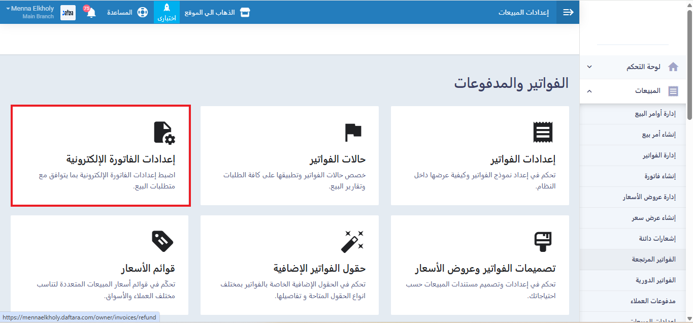 - اضغط على إعدادات الفاتورة الإلكترونية.