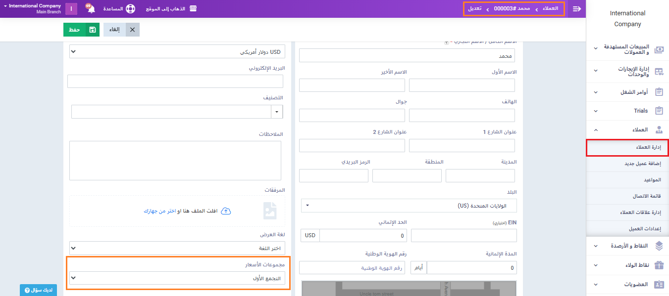 انتقل الآن إلى القائمة الرئيسية، ثم اضغط على “العملاء“، واختر “إدارة العملاء“. بعد ذلك، حدّد العميل الذي ترغب في ربطه بقائمة الأسعار، ثم اضغط على زر “تعديل“.