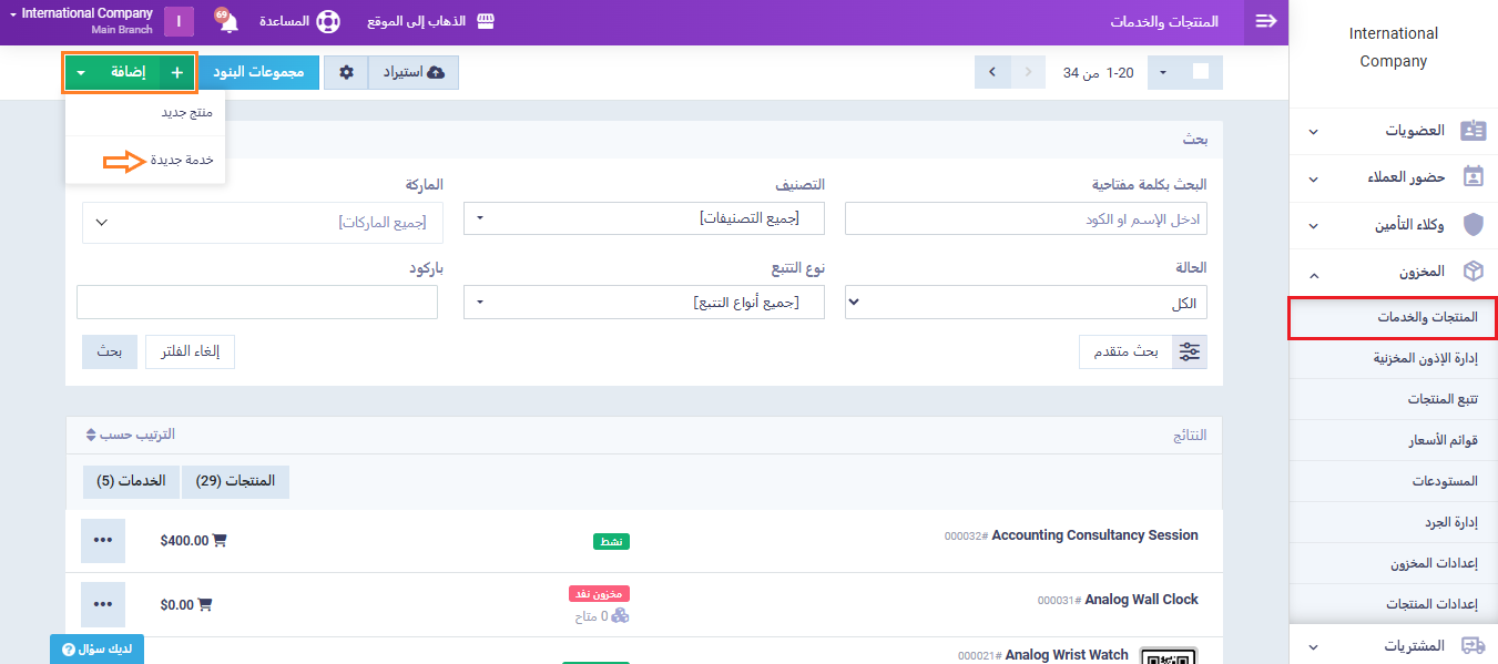 من القائمة الرئيسية اضغط على “المنتجات والخدمات“, ثم اضغط على زر “إضافة” و اختر “خدمة جديدة “.